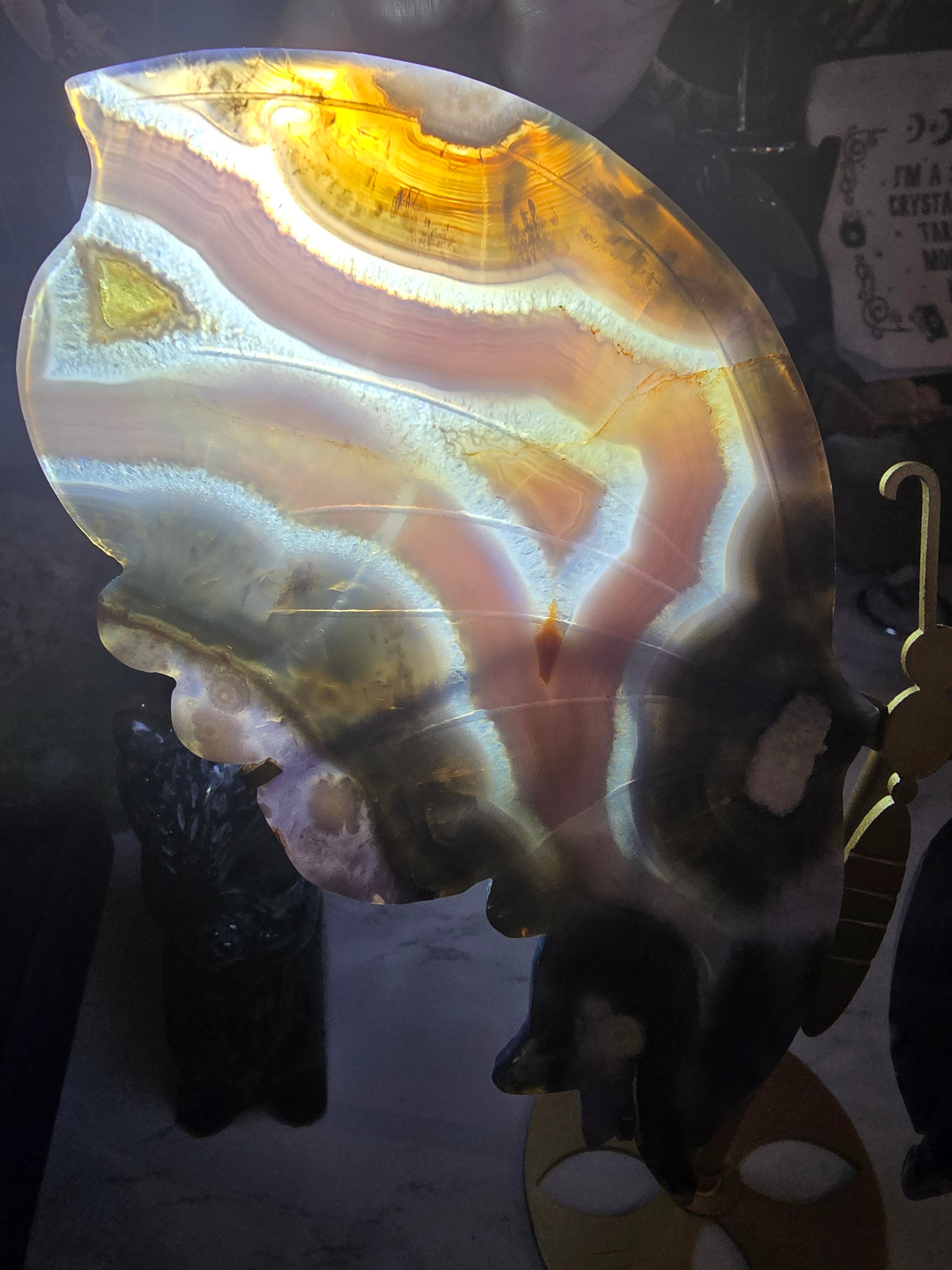 A beautiful pair of XL Butterfly Wings in Blue Flower Agate on a gold coloured stand.